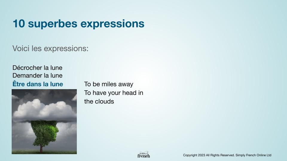 You know when you are daydreaming, in your thoughts...in English, you are in the clouds but in French, you are in...the moon!