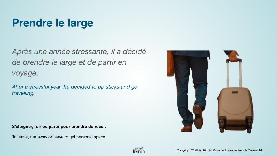 - Après une année stressante, il a décidé de prendre le large et d epartir en voyage. >>> After a stressful year, he decided to up sticks and go travelling.