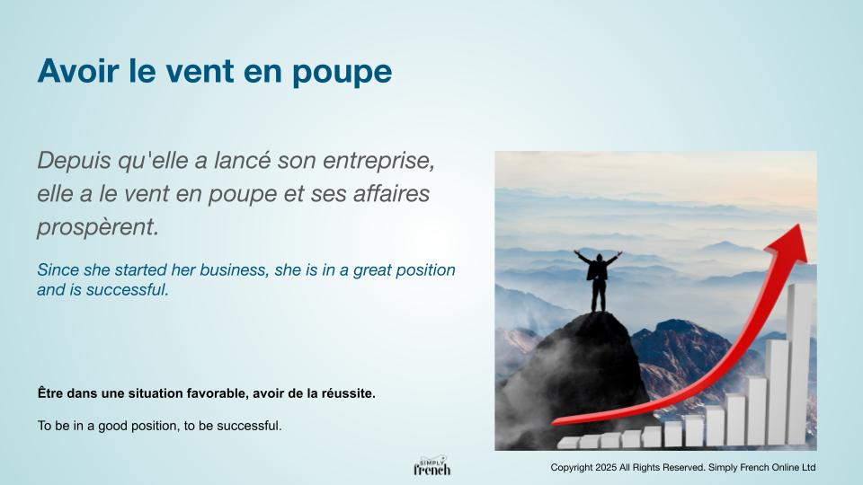 - Depuis qu’elle a lancé son entreprise, elle a le vent en poupe et ses affaires prospèrent. >>> Since she started her business, she is in a great position and is successful.