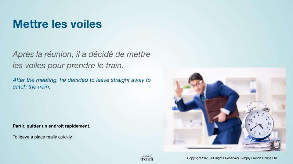 - Après la réunion, il a décidé de mettre les voiles pour prendre le train. >>> After the meeting, he decided to leave straight away to catch the train.