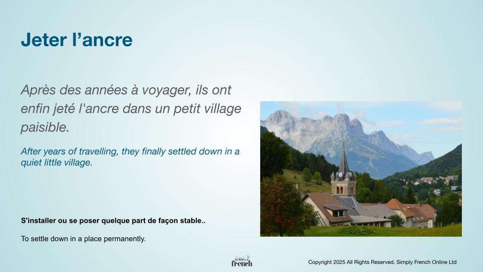 - Après des années à voyager, ils ont enfin jeté l’ancre dans un petit village paisible. >>> After years of travelling, they finally settled down in a quiet little village.