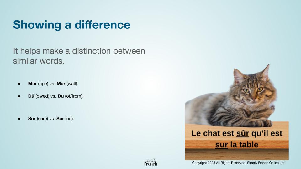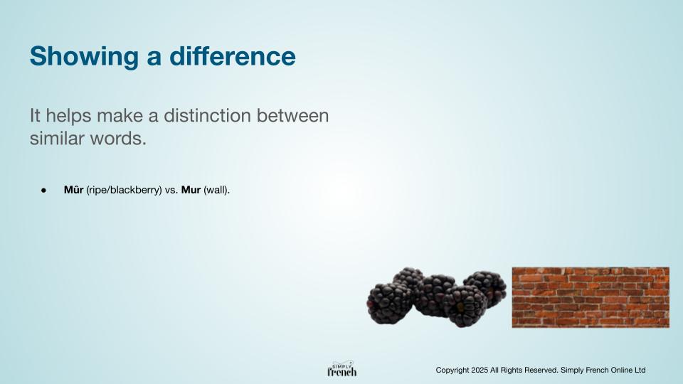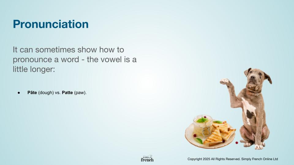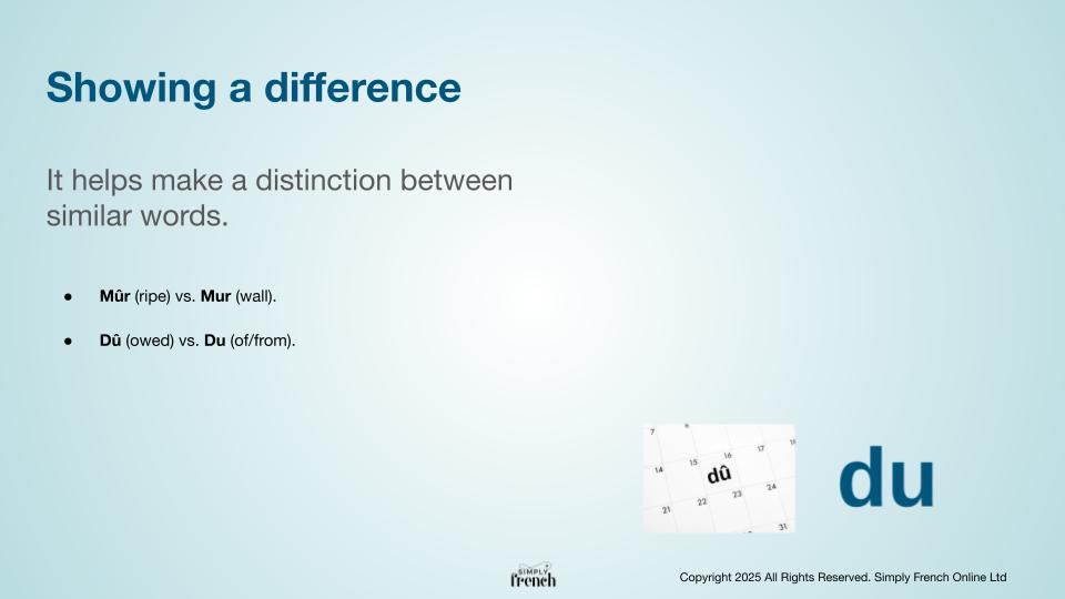 For some words, the circumflex means that the vowel will be a bit longer. Again, the purpose is to distinguish the words because even if the spelling is different, if you don’t pronounce them correctly, they will be the same!