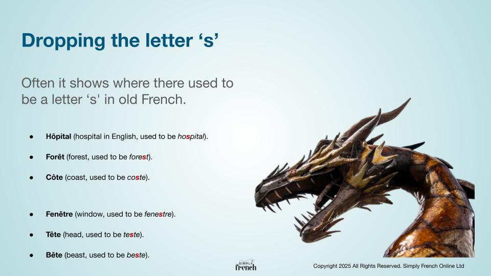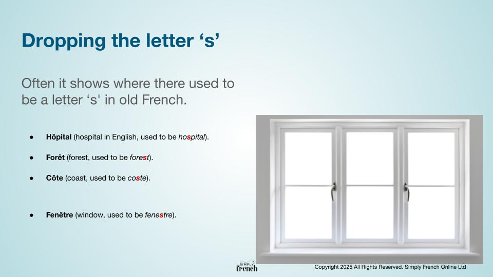 The French language had a dramatic change in its history. Indeed, many words dropped their “s” and put the circumflex accent instead. This accent looks like a hat.