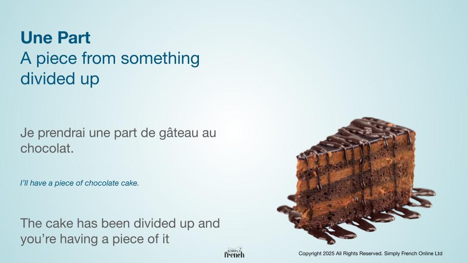 - Je prendrai une part de gâteau au chocolat. >>> I’ll have a piece of chocolate cake.