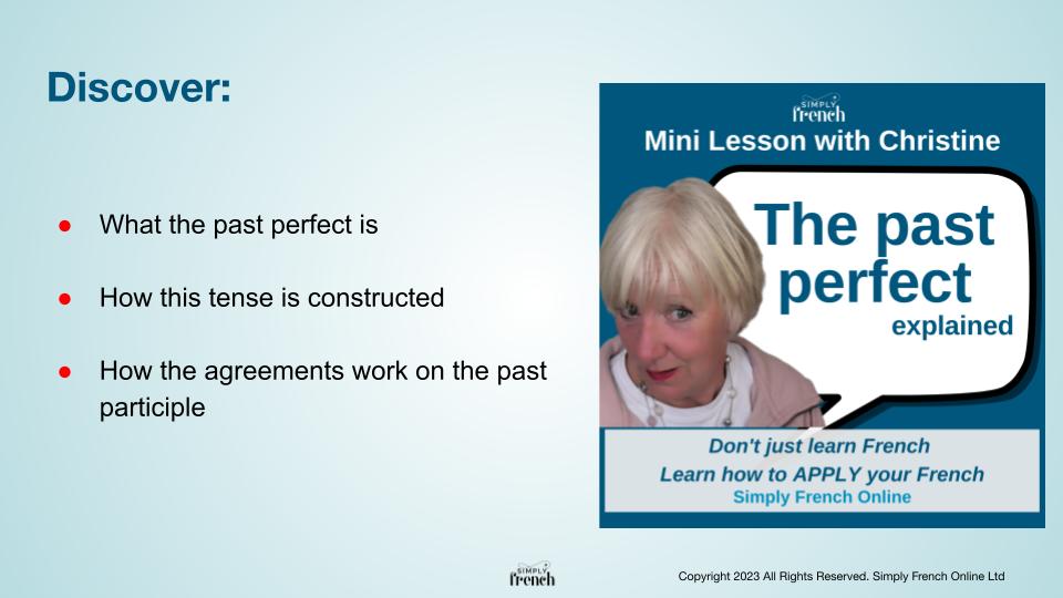 Normally, you would have come across the passé composé before studying this mini-lesson. Why? Because both of them: the present perfect and the past perfect follow the same pattern. They both have an auxiliary and a past participle.